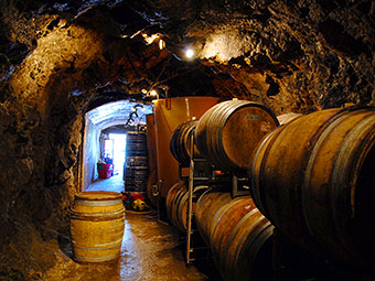 ワインの入った樽をカーヴの中へ。ここは岩をくり抜いた天然の洞窟。中の温度は一年中一定して14度。